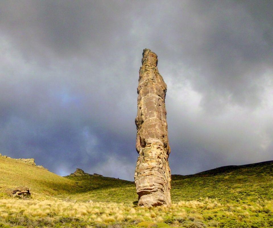 La piedra, solitaria en medio de una pampa, desde lejos va mostrándose creciente en el avanzar hacia ella. Sólo rodeada por coirones, la piedra ha sido pulida por la erosión del viento durante los años y alcanza una altura de alrededor de 40 metros