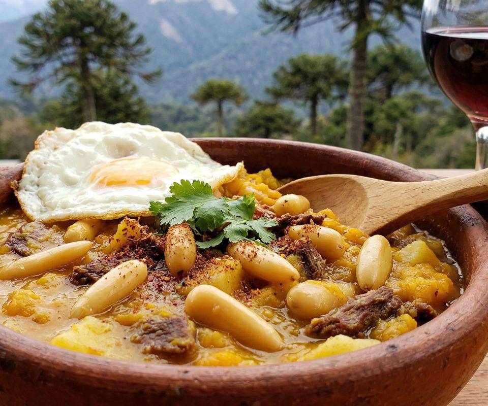 - Reseña: Un tributo a la Araucaria milenaria. Este guiso tradicional chileno se eleva en la Araucanía al reemplazar o complementar la carne con piñones, la semilla sagrada del Pehuenche, aportando un sabor a nuez y una textura única.