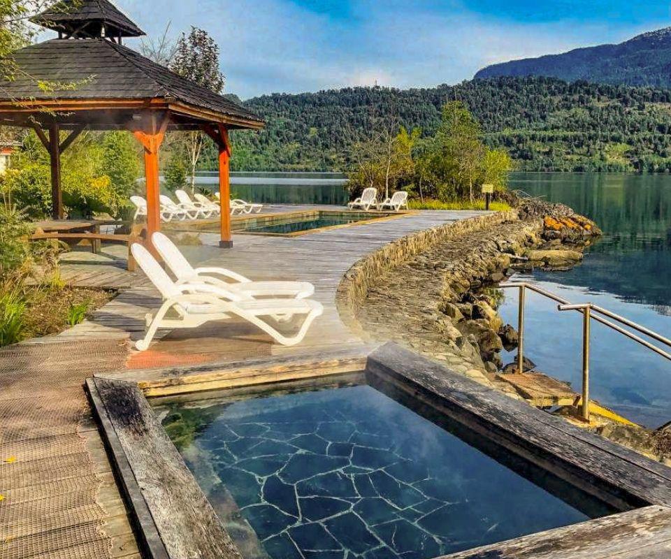 Las Termas Ventisquero, ubicadas en la comuna de Puerto Cisnes, destacan por su privilegiada ubicación a orillas del Fiordo Puyuhuapi, inmersas en el entorno del Parque Nacional Queulat. Su principal atractivo son sus 4 piscinas al aire libre (35°C - 44°C), diseñadas escalonadamente para ofrecer vistas panorámicas al canal y las montañas. A diferencia de opciones más rústicas, cuentan con una infraestructura cómoda y segura, incluyendo pasarelas, vestidores y una acogedora cafetería con ventanales, siendo ideales para familias y para el descanso tras visitar el cercano Ventisquero Colgante.
